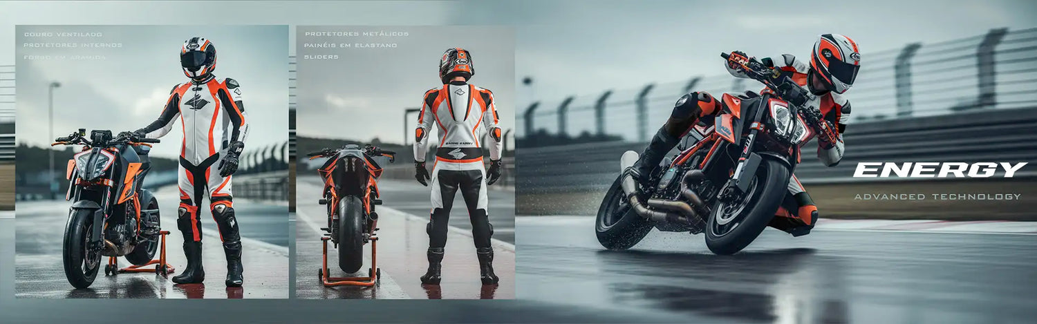 Macacões de corrida em couro legítimo para motos esportivas. Proteção, performance e estilo para uso em pista ou estrada. Tecnologia de segurança de alto nível.